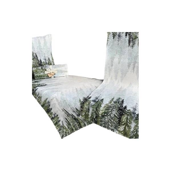 Obrus przygotowany ze świątecznym motywem lasu. Jest cudowną dekoracją stołu w jadalni, kuchni czy salonie. Tak dobrana kolorystyka doskonale wpisuje się w okres świąt Bożego Narodzenia, stając się dodatkową dekoracją wnętrza.