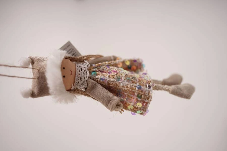 Zawieszka na choinkę przedstawiająca aniołka w beżowo-złotej kolorystyce. Stanowi atrakcyjną formę dekoracji bożonarodzeniowej, podkreślającą klimat i nastrój Świąt.