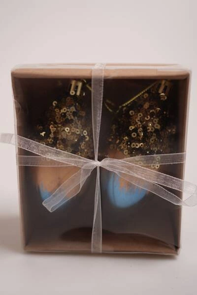 Opakowanie bombek choinkowych w kształcie grubych sopli, przygotowanych w złoto-granatowym kolorze z cekinami. Wykonane z tworzywa, są alternatywą dla szklanych ozdób, zapewniając większą trwałość i wytrzymałość.