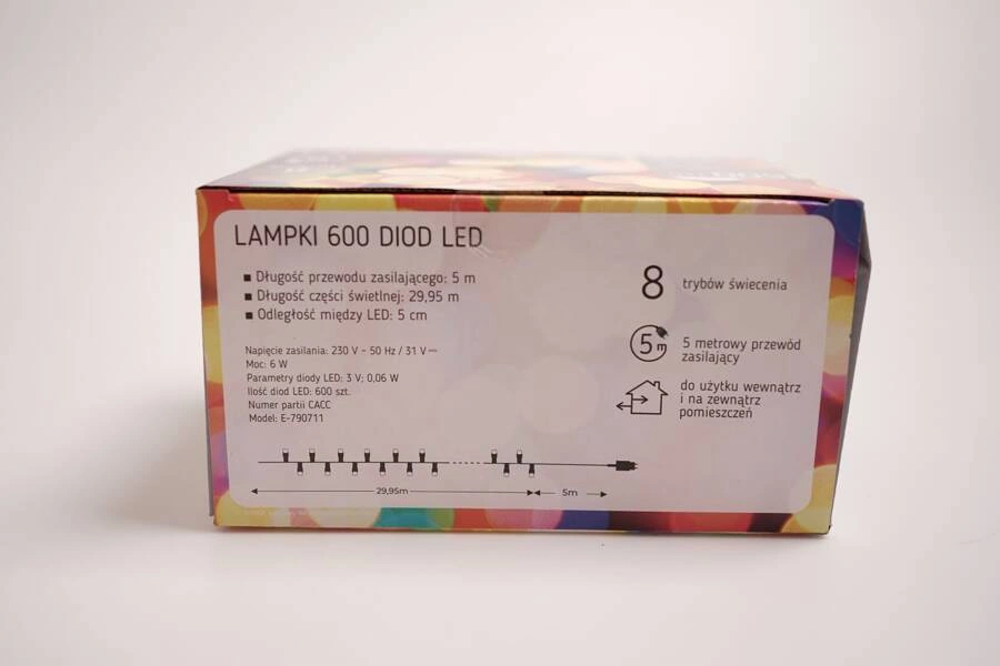 Oświetlenie świąteczne do stosowania wewnątrz i na zewnątrz, które przygotowano z wykorzystaniem 600 diod LED, osadzonych na przewodzie. Lampki świecą wielokolorym światłem. Stanowią bardzo atrakcyjną dekorację, która nadaje ogromnej magii w czasie świąt Bożego Narodzenia.