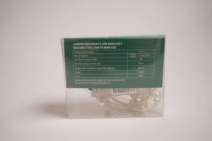 Oświetlenie świąteczne do stosowania wewnątrz, które przygotowano z wykorzystaniem 40 diod LED, osadzonych na transparentnym przewodzie z perełkami. Lampki świecą ciepłym białym światłem. Stanowią bardzo atrakcyjną dekorację, która nadaje ogromnej magii w czasie świąt Bożego Narodzenia.