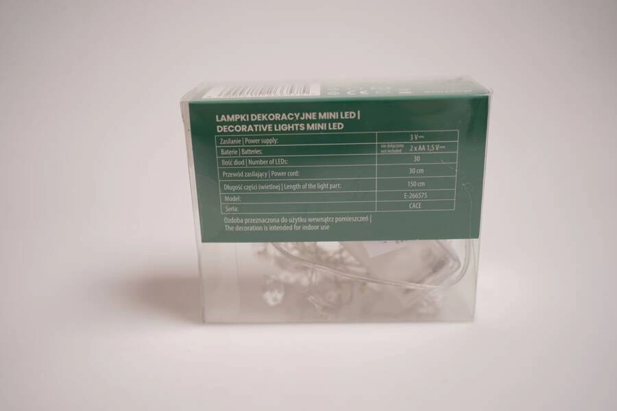 Oświetlenie świąteczne do stosowania wewnątrz, które przygotowano z wykorzystaniem 30 diod LED, osadzonych na transparentnym przewodzie z diamentami. Lampki świecą ciepłym białym światłem. Stanowią bardzo atrakcyjną dekorację, która nadaje ogromnej magii w czasie świąt Bożego Narodzenia.