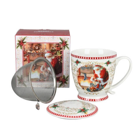 Świąteczny kubek z zaparzaczem o pojemności 480 ml „Mikołaj przy kominku” to nie tylko funkcjonalne naczynie, ale też wyjątkowy klimat przy filiżance ulubionej herbaty. W zestawie znajdziesz kubek, pokrywkę oraz metalowy zaparzacz, które razem pozwalają na wygodne przygotowanie aromatycznego naparu bez fusów. Motyw Mikołaja przy kominku dodaje uroku i czyni z tego zestawu doskonały prezent na zimowe wieczory.