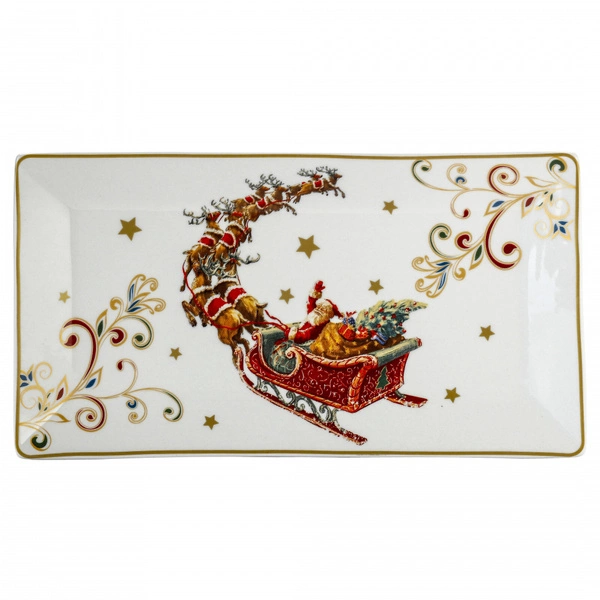 Patera prostokątna Mikołaj w saniach złote ranty 25,5x14cm doskonale sprawdzi się podczas świątecznych spotkań rodzinnych, przyjęć oraz uroczystości. Idealna do serwowania ciast, ciasteczek, owoców, przekąsek lub jako dekoracyjny element stołu. Stanowi również świetny pomysł na prezent dla miłośników świątecznych dodatków do domu.