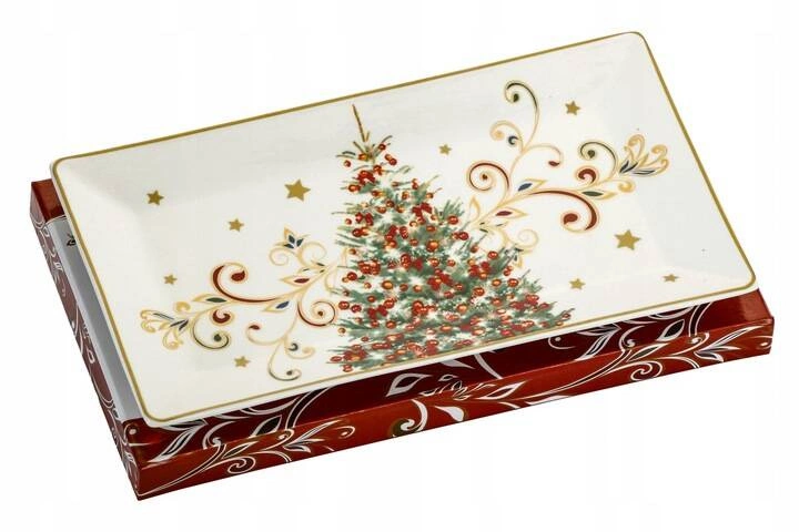 Porcelanowa patera prostokątna Choinka z czerwonymi bombkami i złotymi rantami to stylowy dodatek, który wnosi świąteczny klimat do każdego wnętrza. Wykonana z wysokiej jakości porcelany, łączy dekoracyjny charakter z funkcjonalnością – podniesione ranty ułatwiają serwowanie potraw i zabezpieczają zawartość. Dzięki kompaktowym wymiarom 25,5 × 14 cm idealnie sprawdzi się jako elegancki półmisek na ciasteczka, pierogi czy słodkie przysmaki, a także jako ozdoba stołu. Unikalny wzór choinki z bombkami i złotym obramowaniem przyciąga wzrok i dodaje blasku świątecznym chwilom.