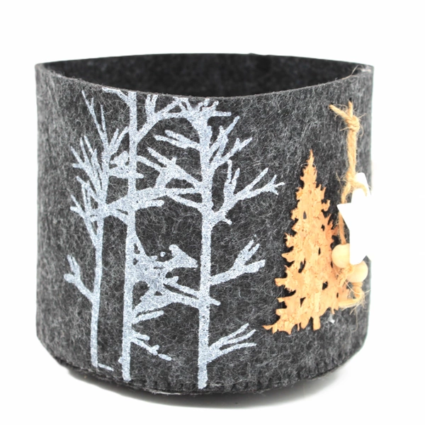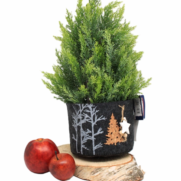 Osłonka wykonana z filcu w kolorze szarym. Ozdobiona wzorem choinki oraz drewnianą gwiazdką. Piękna ozdoba np. małego świątecznego drzewka.