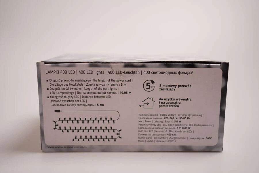 Oświetlenie świąteczne do stosowania wewnątrz i na zewnątrz, które przygotowano z wykorzystaniem 400 diod LED, osadzonych na przewodzie. Lampki świecą zimnym białym światłem. Stanowią bardzo atrakcyjną dekorację, która nadaje ogromnej magii w czasie świąt Bożego Narodzenia.