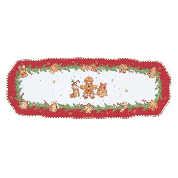 Patera owalna Ciastek biało-czerwony 37x14cm to stylowe i praktyczne naczynie wykonane z wysokiej jakości porcelany. Dzięki świątecznemu motywowi ciastka oraz biało-czerwonej kolorystyce idealnie podkreśla atmosferę rodzinnych spotkań i nadaje wyjątkowy charakter każdemu stołowi. Podniesione ranty zapewniają wygodę podczas serwowania ulubionych potraw, ciast czy przekąsek, chroniąc przed zsuwaniem się dań. Patera doskonale sprawdzi się podczas świąt oraz codziennych spotkań, będąc jednocześnie funkcjonalną ozdobą i elementem dekoracyjnym. Możliwość mycia w zmywarce gwarantuje szybkie i łatwe utrzymanie czystości.