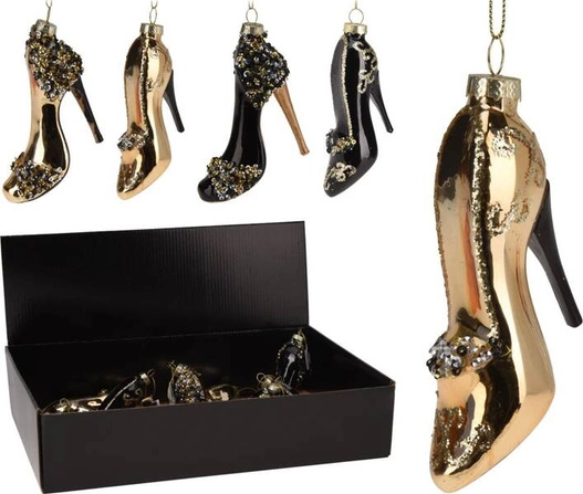 Szklane bombki dmuchane w kształcie pantofelka. Zawieszki dostępne w czterech wzorach, w kolorystyce złotej i czarnej.
