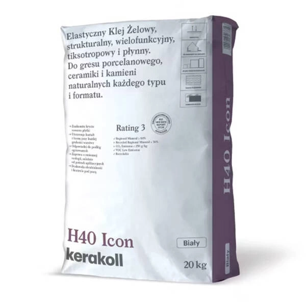 Klej żelowy H40 Icon C2TE Biały 20kg Kerakoll znajduje zastosowanie w klejeniu płytek gresowych, ceramicznych i kamiennych każdego formatu – od małych po wielkoformatowe (do 180x360 cm). Przeznaczony do montażu na podłogach i ścianach, zarówno wewnątrz, jak i na zewnątrz budynków. Idealny do aplikacji na ogrzewaniu podłogowym i ściennym, a także do klejenia na istniejących płytkach, hydroizolacjach, tarasach, balkonach, elewacjach, w basenach i fontannach.