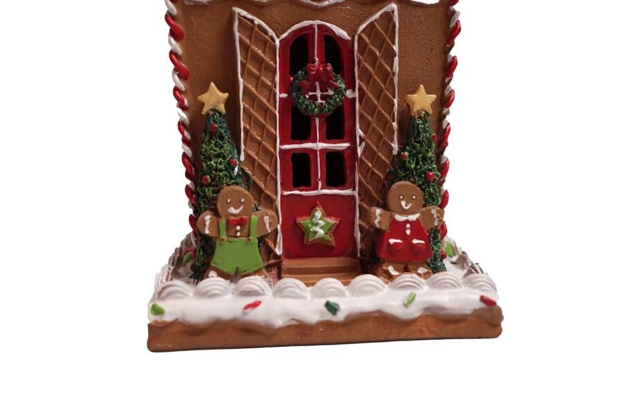 Bardzo atrakcyjny wizualnie domek z piernika, lukrowany na czerwono. Jest to dekoracja, którą przygotowano z myślą o okresie świąt Bożego Narodzenia. Wewnątrz domku umieszczono oświetlenie LED. Wnosi do wnętrza magię, klimat i nastrój tego okresu.