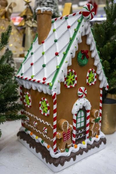 Bardzo atrakcyjny wizualnie domek z piernika, lukrowany na biało z ciastkiem. Jest to dekoracja, którą przygotowano z myślą o okresie świąt Bożego Narodzenia. Wnosi do wnętrza magię, klimat i nastrój tego okresu.