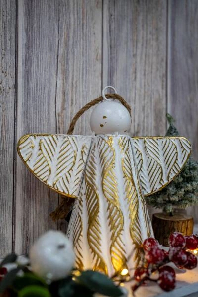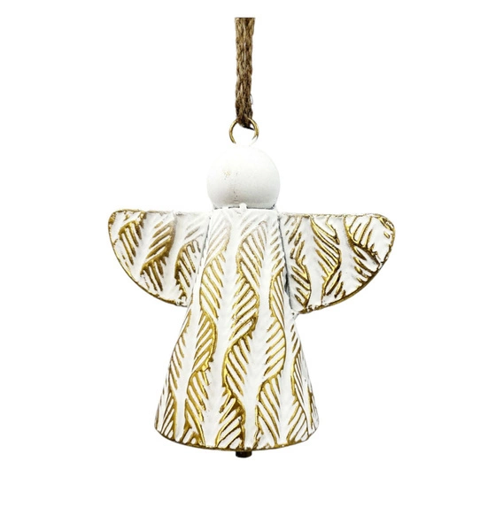 - Anioł metalowy dzwonek biało-złoty przecierany na sznurze 19x12x21 cm