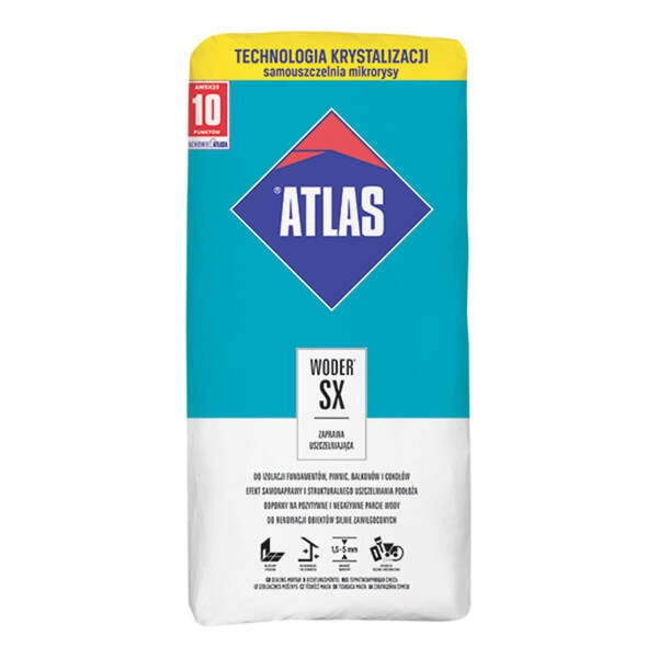 Atlas Woder SX służy do zabezpieczania przed negatywnym i pozytywnym odziaływaniem wody. Posiada bardzo szerokie spectrum zastosowania. Zalecany jest do wykonywania izolacji podziemnych części budynków, fundamentów, piwnic, cokołów, schodów zewnętrznych, balkonów oraz konstrukcji inżynierskich, np.: zbiorników na ścieki komunalne, gnojowice itp.
