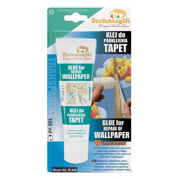 Klej do podklejania tapet 100ml Technicqll doskonale sprawdza się przy naprawie i podklejaniu krawędzi tapet każdego typu, przy mocowaniu bordów, pasków ozdobnych oraz w szybkim montażu ogłoszeń, reklam, nekrologów na tablicach i słupach wykonanych z różnych materiałów – betonu, metalu, drewna i tworzyw sztucznych.