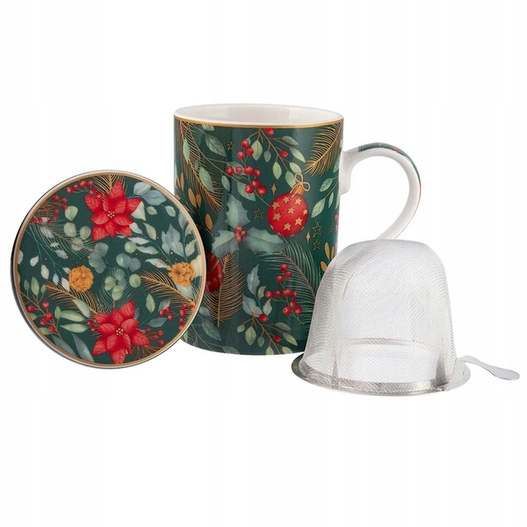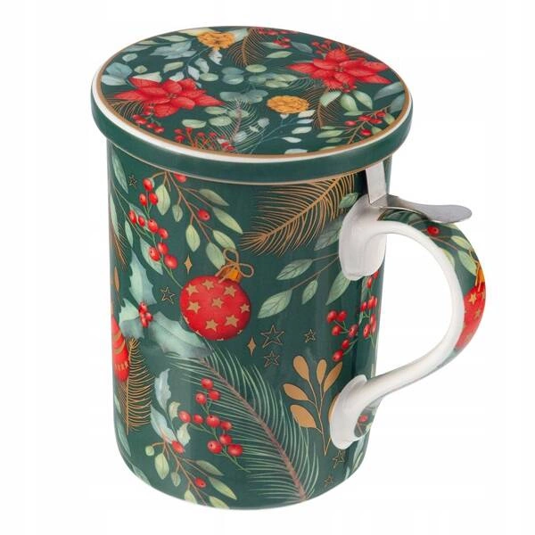 Kubek z zaparzaczem 350ml zielony czerwone bombki sprawdzi się podczas codziennego parzenia herbaty, ziół i innych naparów. Idealny na zimowe wieczory, spotkania rodzinne oraz jako prezent świąteczny dla miłośników ciepłych napojów.