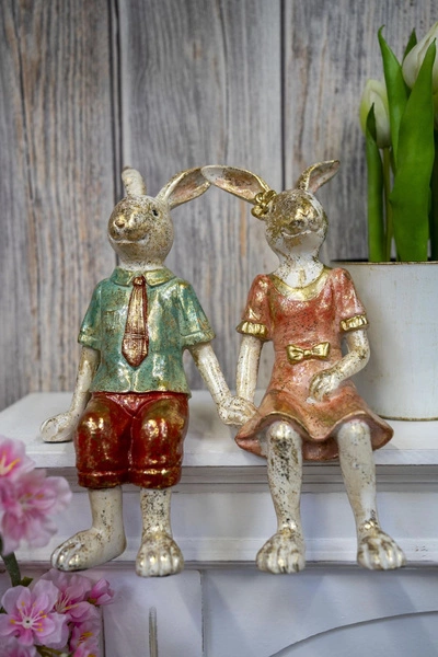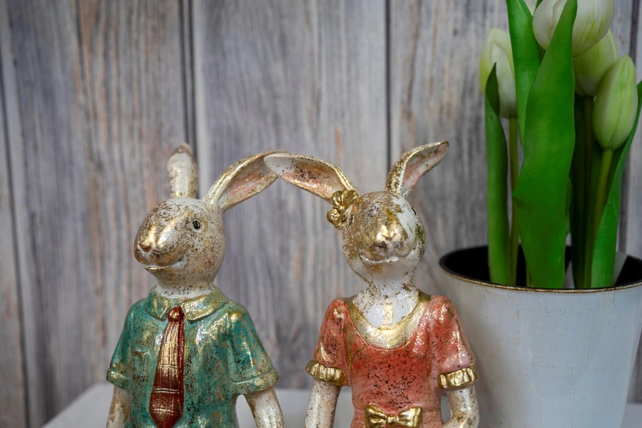 Dekoracja przygotowana w formie pięknej figurki. Pozwoli na aranżację wnętrza w okresie świąt Wielkanocy. Bardzo starannie wykonana, przedstawia parę królików, przygotowanych w złotym kolorze, ubrane w zielono-czerwone ubrania. Został dodatkowo poprzycierany dla dodania jeszcze większego uroku i charakteru. Nadaje wyjątkowego klimatu każdej przestrzeni domowej.