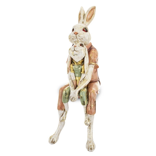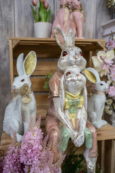 Dekoracja przygotowana w formie pięknej figurki. Pozwoli na aranżację wnętrza w okresie świąt Wielkanocy. Bardzo starannie wykonana, przedstawia panią królik z dzieckiem, przygotowanych w złotym kolorze, ubrane w różowo-zielone ubrania. Został dodatkowo poprzycierany dla dodania jeszcze większego uroku i charakteru. Nadaje wyjątkowego klimatu każdej przestrzeni domowej.