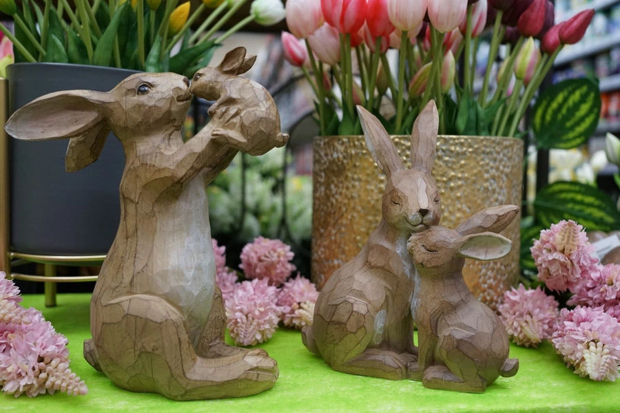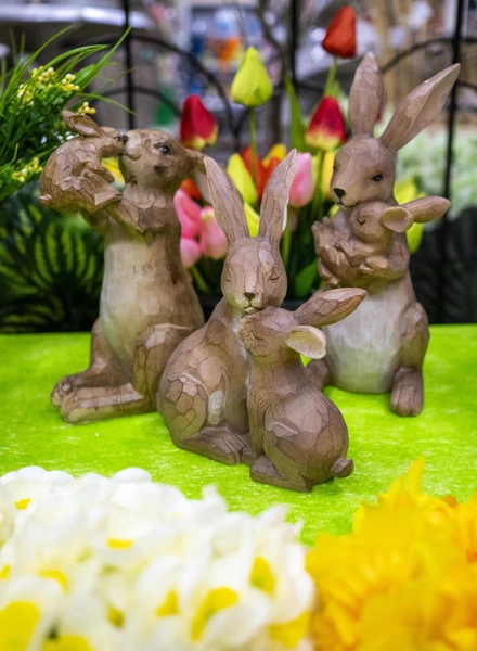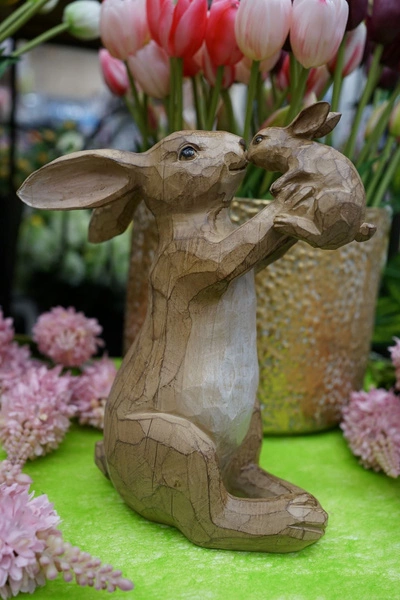 Dekoracja, która pozwoli na aranżację wnętrza w okresie świąt Wielkanocy. Bardzo starannie wykonana, przedstawia panią królik na rękach, całującą dziecko. Nadaje wyjątkowego charakteru każdej przestrzeni domowej.