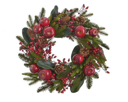 - Zachwycające połączenie świerkowych gałązek, czerwonych jabłek i szyszek → wprowadza świąteczną radość i ciepło do każdego wnętrza