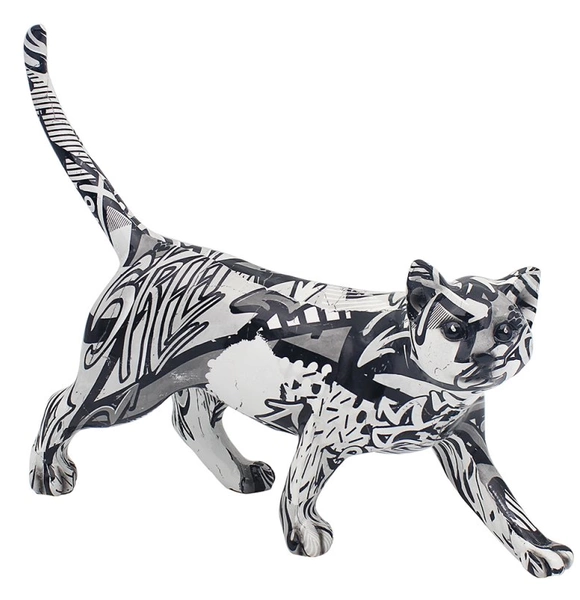 Figurka przedstawiająca kota. Ozdoba wykonana z mocnego stabilnego gipsu pokrytego masą plastyczną malowaną we wzory w stylu nowoczesnego graffiti w kolorach biało-szaro-czarnych.