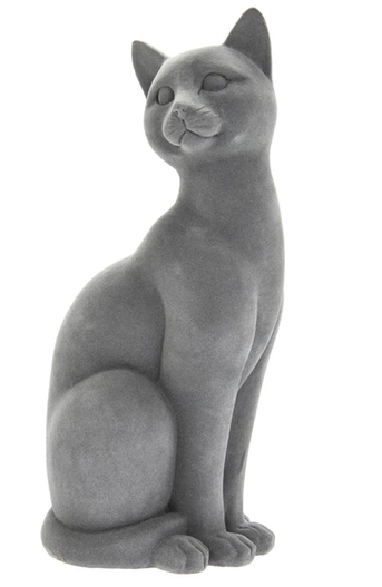 Urocza figurka siedzącego kota, wykonana z polirezonu i pokryta szarym welurem. To stylowa dekoracja, która z przyciągnie uwagę każdego miłośnika kotów. Również wspaniały pomysł na prezent.