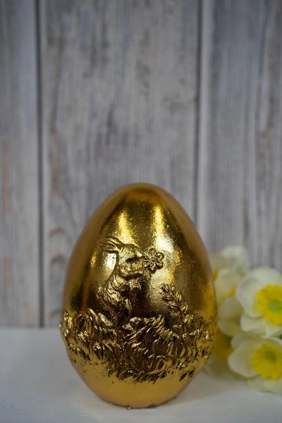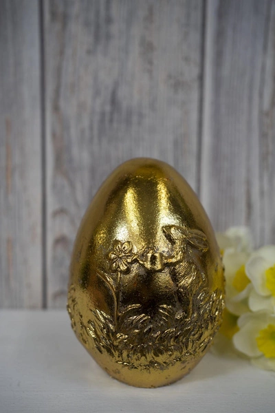 Figurka przedstawiająca jajko. Przygotowano je w złotym, atrakcyjnym kolorze, a jego powierzchnię udekorowano królikiem na trawie. Stanowi wspaniałą dekorację, zwłaszcza w okresie Wielkanocy.