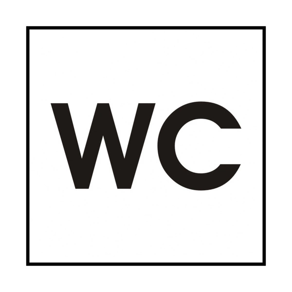 Tablica informacyjna przygotowana na białym tle z czarnym napisem "WC"