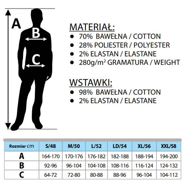 Skład materiału: 70% bawełna, 28% poliester + 2% elastan