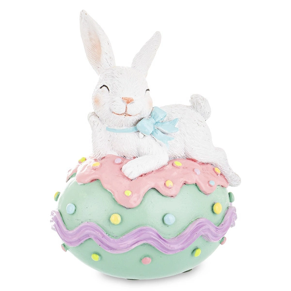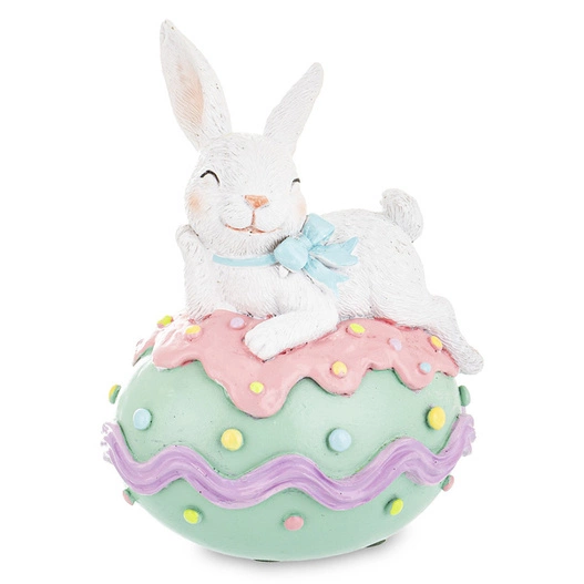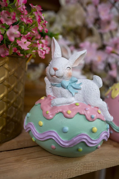 Dekoracja przygotowana w formie pięknej figurki. Pozwoli na aranżację wnętrza w okresie świąt Wielkanocy. Bardzo starannie wykonana, przedstawia białego królika na jajku w zielono-pastelowych kolorach. Nadaje wyjątkowego klimatu każdej przestrzeni domowej.