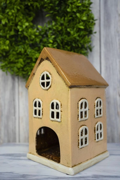 Piękny lampion - domek ceramiczny, przygotowany w atrakcyjnej kolorystyce - beżowej z brązowym dachem.