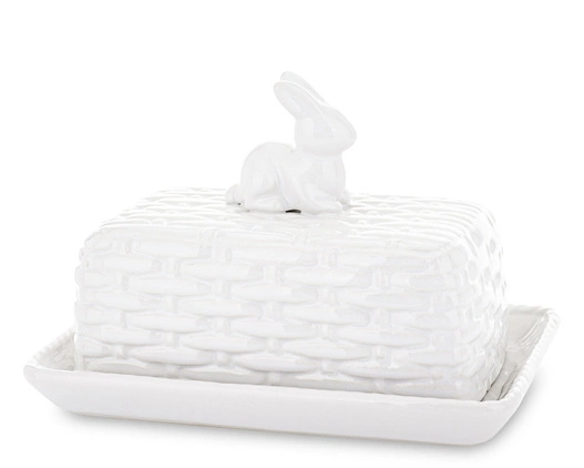 Piękna biała maselniczka wykonana z ceramiki. Na pokrywce maselniczki znajduje się urocza figurka białego królika, która nadaje jej wyjątkowego charakteru. Doskonale sprawdzi się w codziennym użytkowaniu oraz jako element dekoracyjny na stole podczas spotkań rodzinnych czy przyjęć.