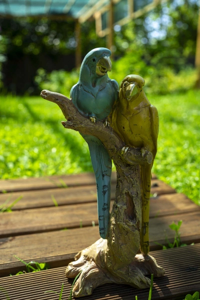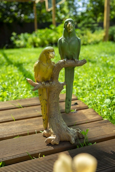 Figurka ceramiczna dwie papugi na brązowym konarze. Figurka w dwóch wersjach kolorostycznych: żółto-zielona lub turkusowo-złota. Została wykonana z dbałością o detale, pięknie pomalowana.