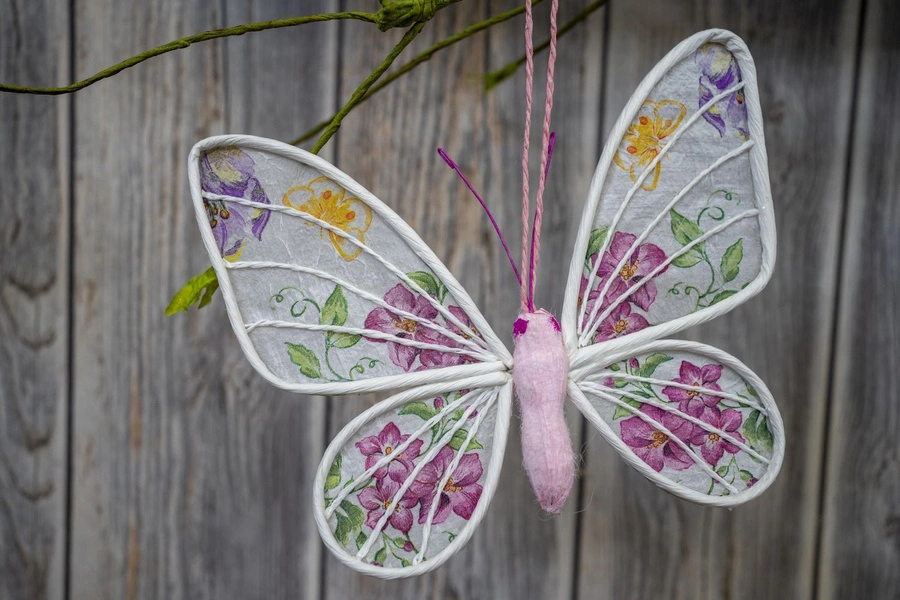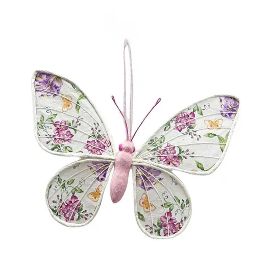 Zawieszka przygotowana w formie motyla. ozdobę przygotowano z papieru, który pomalowano w żywe barwy. Stanowi atrakcyjną formę dekoracji korespondującą z okresem wiosny, ale może być wykorzystana również przy innych okazjach. Sprawdza się doskonale jako ozdoba samodzielna, jak również jako składnik większej kompozycji dekoracyjnej.