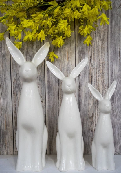Figurka Zając ceramiczny zamyślony biały 31cm pięknie prezentuje się solo, ale także w duecie z innymi dekoracjami wielkanocnymi: świecami, stroikami czy roślinnymi kompozycjami. To również świetny pomysł na drobny, pełen uroku prezent dla miłośniczki przytulnych dodatków do domu.