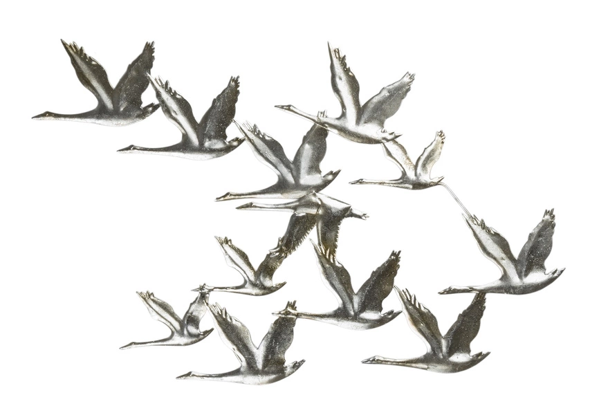Piękna i stylowa dekoracja wnętrza. Przedstawia metalowe jaskółki, które lecą w kluczu. Kolorystyka srebrna. To niezwykle fascynujący obiekt dekoracyjny, który wprowadza do wnętrza niepowtarzalny nastrój.