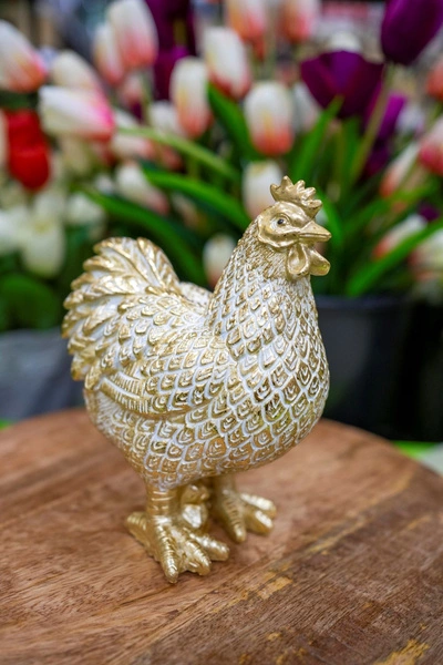 Dekoracja, która pozwoli na aranżację wnętrza w okresie świąt Wielkanocy. Bardzo starannie wykonana, przedstawia kurę przygotowaną w złoto-białym kolorze. Nadaje wyjątkowego charakteru każdej przestrzeni domowej.