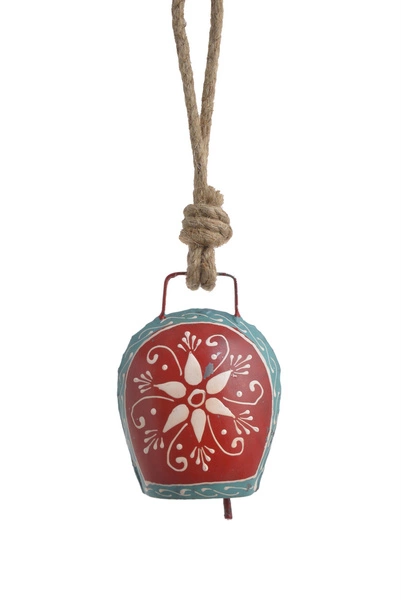 Zawieszka dzwon metalowy czerwono-miętowy sznur jutowy 7,5x4x10cm