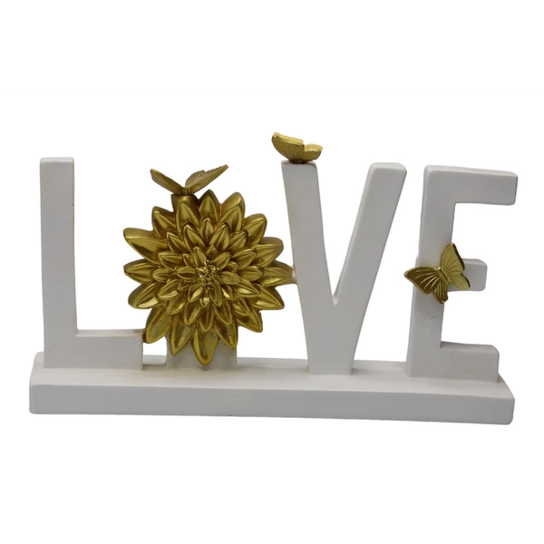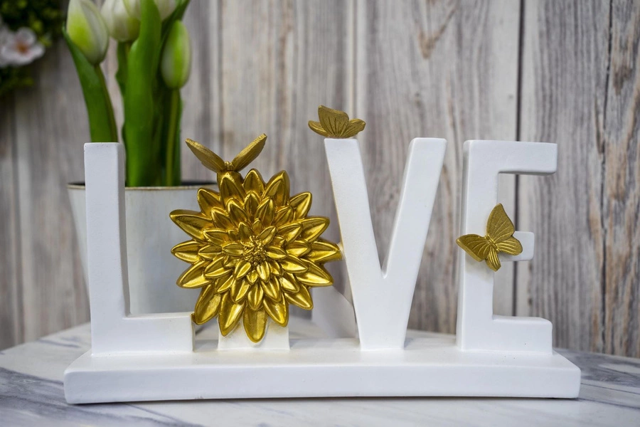 Dekoracyjny napis "Love", przygotowany w białym kolorze i ozdobiony złotym kwiatem oraz motylami. Napis wnosi pozytywną, mocną energię do wnętrza domu, stając się jego charakterystycznym elementem. Starannie wykonany, komponuje się doskonale z wnętrzami o każdym charakterze.
