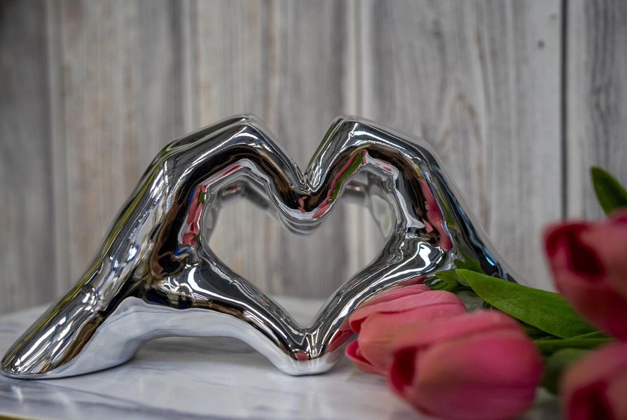 Dłonie ceramiczne srebrne 24x8x10,5cm to elegancka figurka, która od razu przyciąga wzrok. Dwie delikatnie złączone dłonie tworzą kształt serca, symbolizując bliskość, miłość i wdzięczność. Lśniąca, srebrna powierzchnia pięknie odbija światło, dodając aranżacji szlachetnego połysku i odrobiny luksusu.