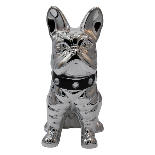 - Skarbonka buldog srebrny z czarną obrożą i cekinami