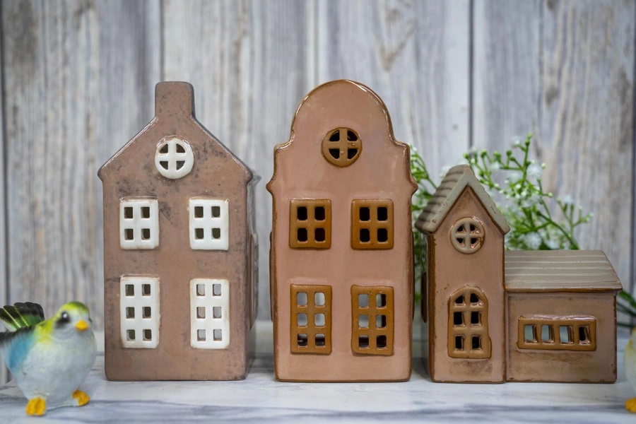 Piękny lampion - domek ceramiczny, przygotowany w atrakcyjnej kolorystyce brązowo-beżowej i bardzo pięknej wizualnie formie.