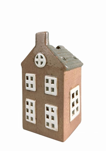 Domek na T-light ceramiczny brązowy, białe okna lampion świecznik 8x16cm