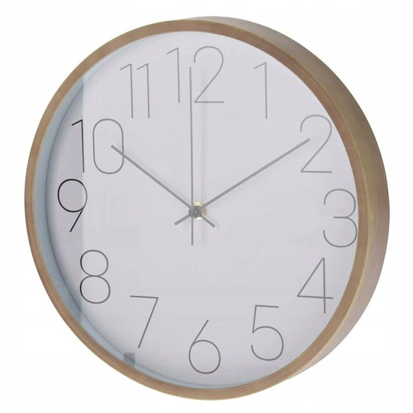 Zegar ścienny w klasycznym kształcie okręgu został otoczony drewnianym konturem. Tarcza z dużymi cyframi. Świetnie realizuje swoją funkcję praktyczną, stając się jednocześnie atrakcyjną ozdobą wnętrza.