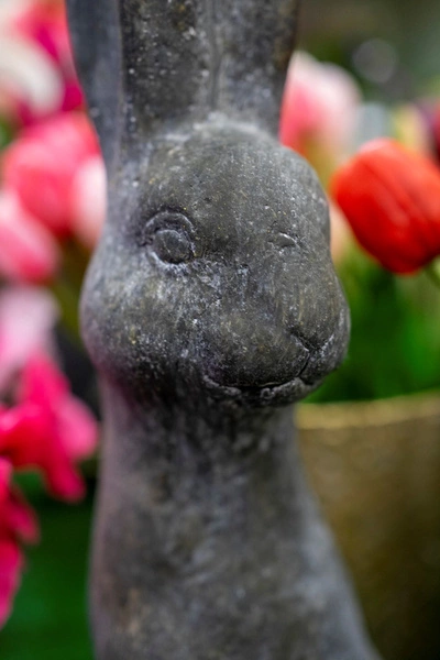 Figurka przedstawiająca pana zająca z betonu. Jest elementem dekoracyjnym, który wpływa na klimat wnętrza, zwłaszcza w okresie Wielkanocy.
