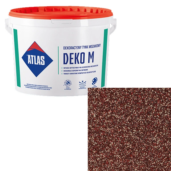 Deko M jest specjalnie przygotowaną linią tynków mozaikowych, opartych na nowoczesnej bazie składającej się z mieszanki wodnych dyspersji akrylowych, środków hydrofobizujących, dodatków modyfikujących oraz specjalnie wyselekcjonowanych kruszyw naturalnych i barwionych.