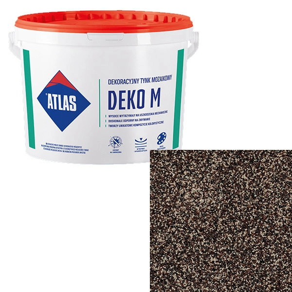 Deko M jest specjalnie przygotowaną linią tynków mozaikowych, opartych na nowoczesnej bazie składającej się z mieszanki wodnych dyspersji akrylowych, środków hydrofobizujących, dodatków modyfikujących oraz specjalnie wyselekcjonowanych kruszyw naturalnych i barwionych.