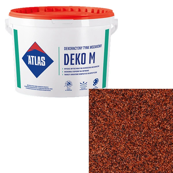 Deko M jest specjalnie przygotowaną linią tynków mozaikowych, opartych na nowoczesnej bazie składającej się z mieszanki wodnych dyspersji akrylowych, środków hydrofobizujących, dodatków modyfikujących oraz specjalnie wyselekcjonowanych kruszyw naturalnych i barwionych.