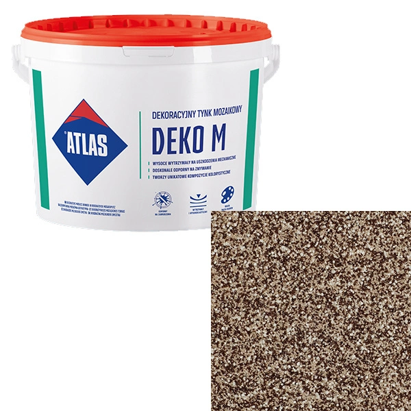 Deko M jest specjalnie przygotowaną linią tynków mozaikowych, opartych na nowoczesnej bazie składającej się z mieszanki wodnych dyspersji akrylowych, środków hydrofobizujących, dodatków modyfikujących oraz specjalnie wyselekcjonowanych kruszyw naturalnych i barwionych.