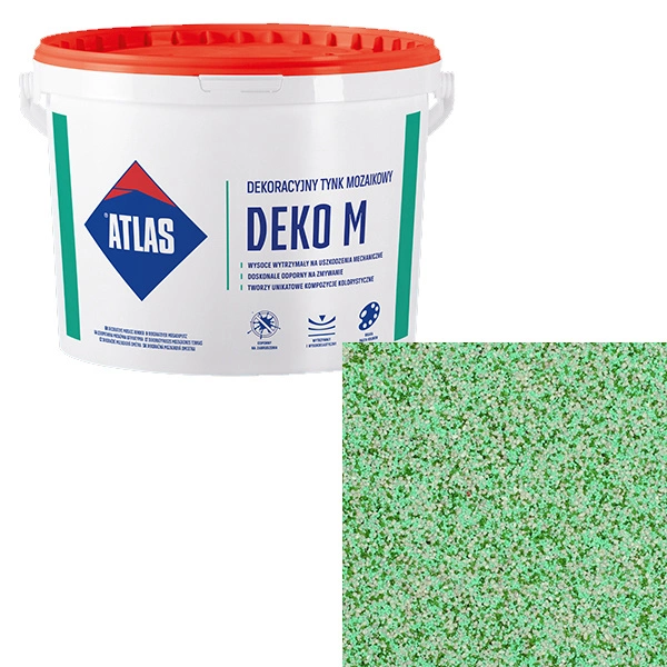 Deko M jest specjalnie przygotowaną linią tynków mozaikowych, opartych na nowoczesnej bazie składającej się z mieszanki wodnych dyspersji akrylowych, środków hydrofobizujących, dodatków modyfikujących oraz specjalnie wyselekcjonowanych kruszyw naturalnych i barwionych.